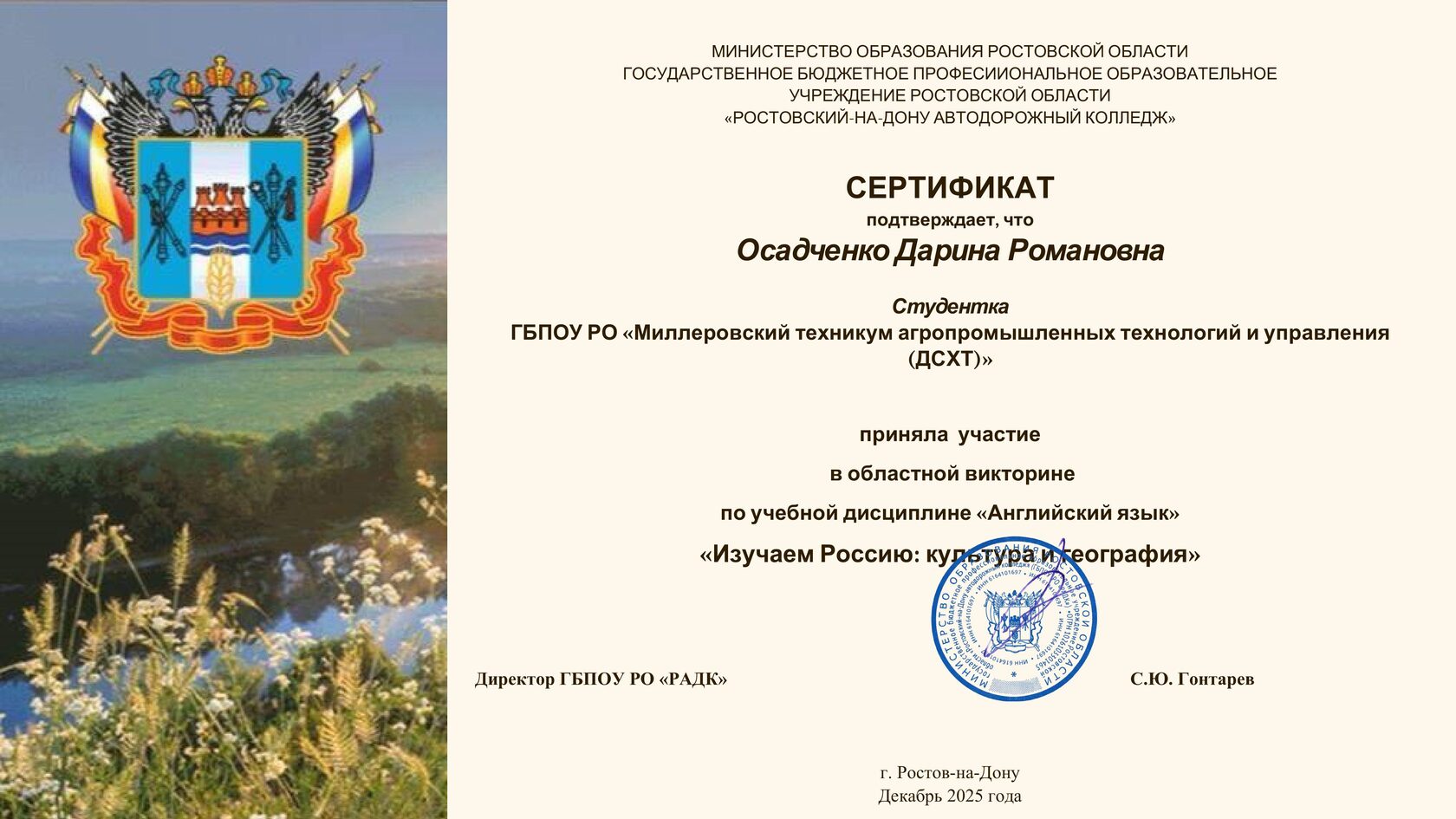 Подведены итоги областной викторины «Изучаем Россию: культура и география» по учебной дисциплине «Английский язык», проходившей на базе ГБПОУ РО «Ростовский-на-дону автодорожный колледж». Викторина была организована с целью повышения интереса к изучению России, развития лингвистических и социокультурных компетенций, расширения кругозора студентов. Она стала отличной площадкой для проверки знаний не только по английскому языку, но и по культуре и географии нашей страны.