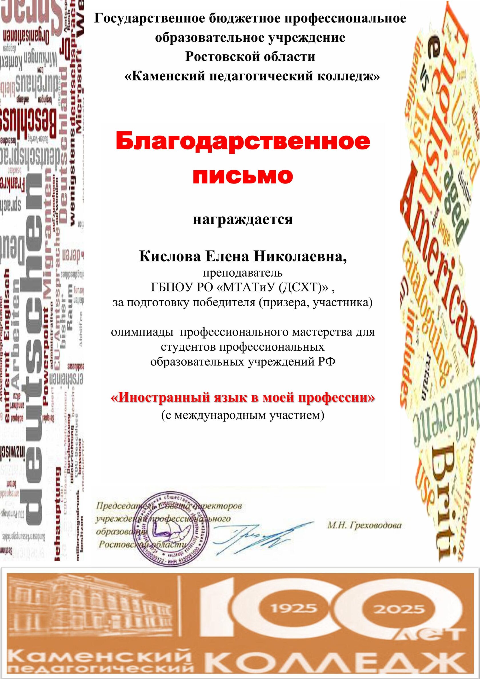Благодаря их усердию и наставничеству преподавателя английского языка Кисловой Е.Н., студентки смогли успешно выступить на викторине. Кислова Е.Н. получила благодарственное письмо за свою ценную наставническую деятельность и вклад в подготовку обучающихся к областному мероприятию. Ее профессионализм, любовь к предмету и умение мотивировать студентов заслуживают высокой оценки.