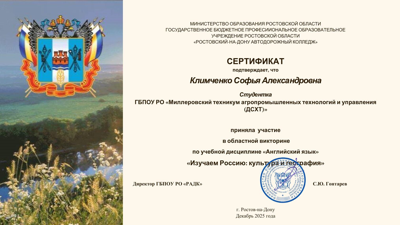 Студентки ГБПОУ РО «МТАТиУ (ДСХТ)» Климченко Софья Александровна и Осадченко Дарина Романовна продемонстрировали хороший уровень подготовки и глубокое понимание русской культуры и географии. Они показали превосходные знания, отвечая на каверзные вопросы на английском языке, доказав, что изучение иностранного языка может стать ключом к пониманию своей страны.