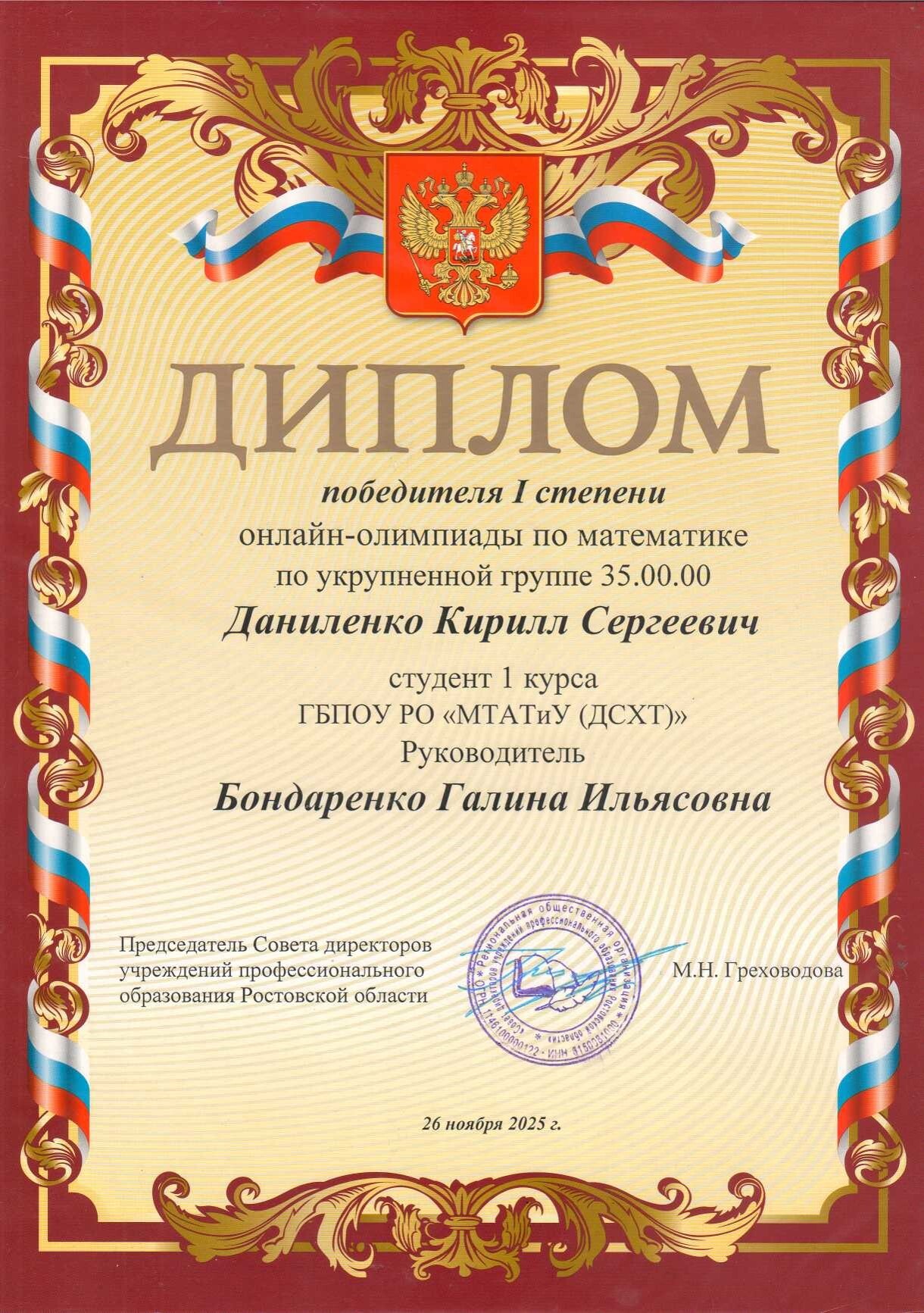 По результатам напряженной борьбы, победителем областной олимпиады стал студент 1-го курса Даниленко Кирилл из ГБПОУ РО «МТАТиУ (ДСХТ)»! Кирилл продемонстрировал глубокое понимание математических методов и их эффективное применение в аграрных процессах. Его успех – результат упорного труда и целеустремленности.