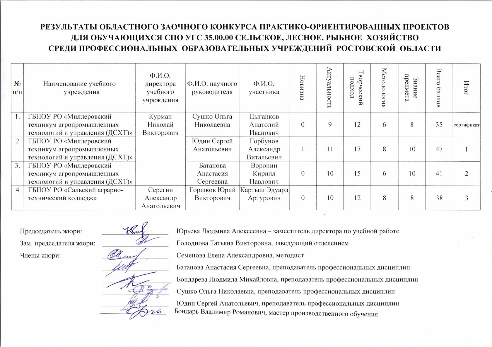 РЕЗУЛЬТАТЫ ОБЛАСТНОГО ЗАОЧНОГО КОНКУРСА ПРАКТИКО-ОРИЕНТИРОВАННЫХ ПРОЕКТОВ ДЛЯ ОБУЧАЮЩИХСЯ СПО УГС 35.00.00 СЕЛЬСКОЕ,ЛЕСНОЕ, РЫБНОЕ ХОЗЯЙСТВО СРЕДИ ПРОФЕССИОНАЛЬНЫХ ОБРАЗОВАТЕЛЬНЫХ УЧРЕЖДЕНИЙ РОСТОВСКО