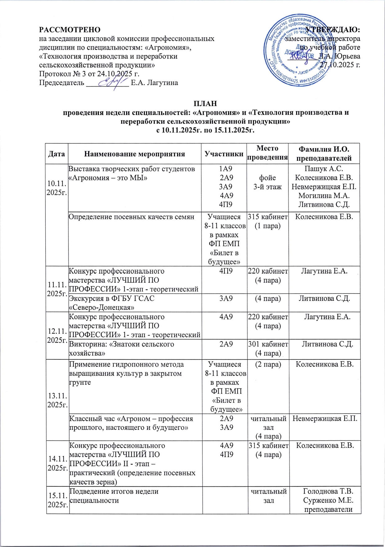 План проведения недели специальностей : "Агрономия " и "Технология производства и переработки сельскохозяйственной продукции"
